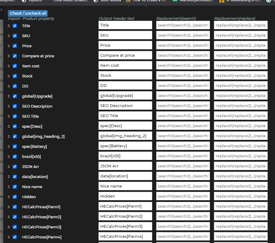 We can choose columns we want to export. For example common file formats for shops could be just SKU and Price CSV. Let's make such a file. I will choose the Horizontal format since SKUs and Prices exist only for variants [NARRATOR SELECTS the HORIZONTAL format] . I will now click “Check/Uncheck” to turn off all columns [NARRATOR clicks “Check/Uncheck” button in the export dialog to uncheck all] .