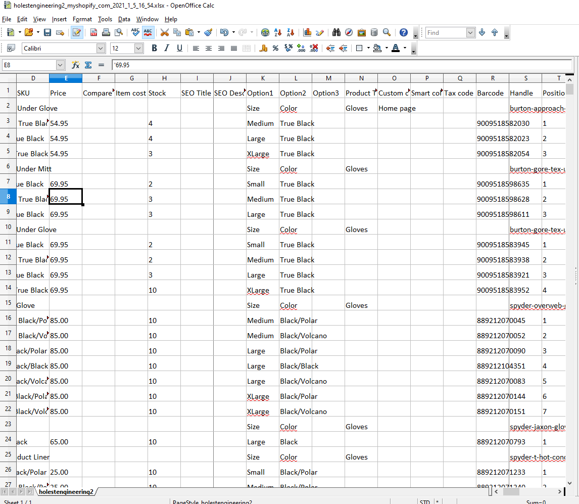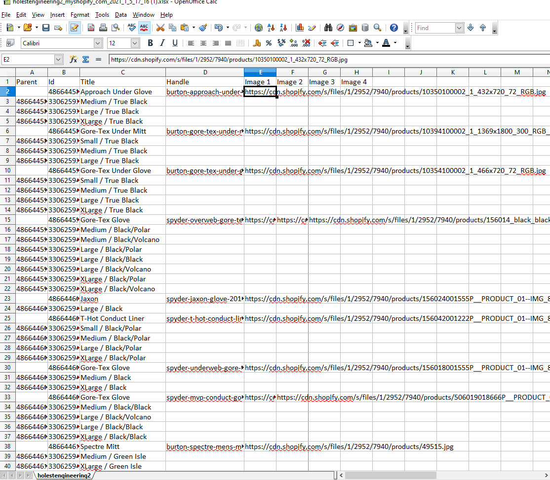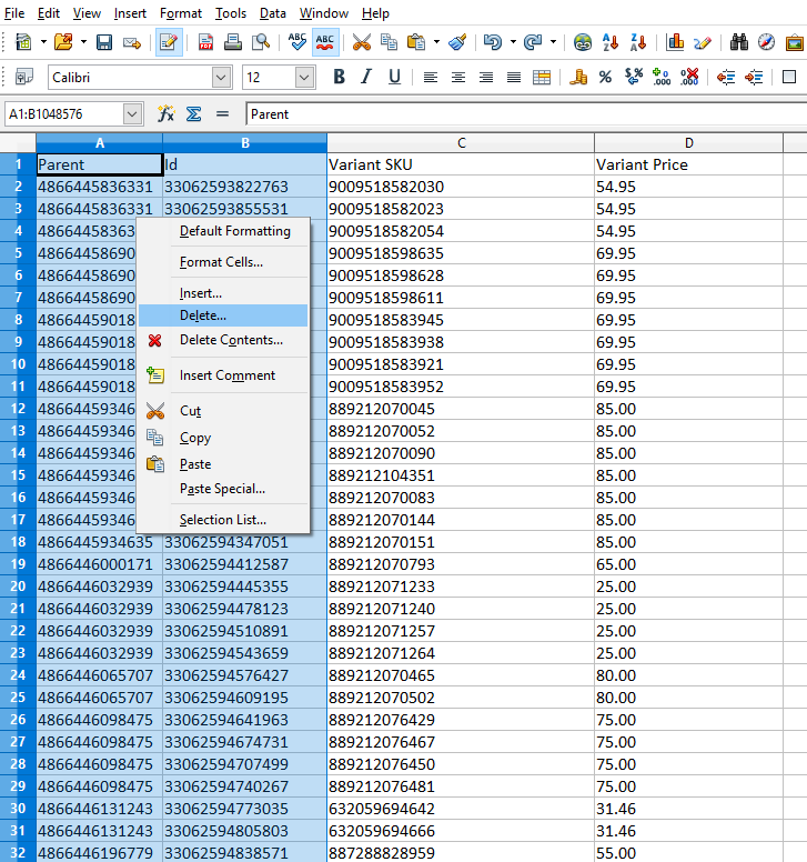 Here we see our data. We see app added id and parent id columns since this data ultimately identifiees products and variants. We can easily remove them if we want [NARRATOR removes id and Parent column from PC excel app] .