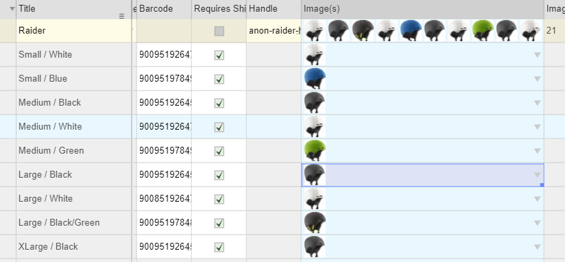 To show you this feature in action , I will pick some product that has an size and color options. Image for all variant sizes of the same color is the same. I have a product call “Raider” that is Helmet [NARRATOR enters “Raider” in title filter box and clicks the “Filter” button]