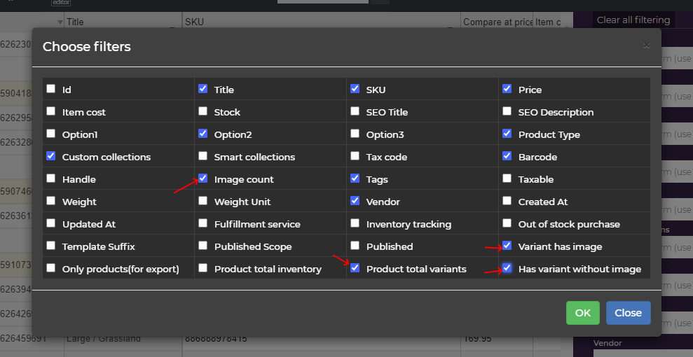 So we have Image count [NARRATOR checks ‘ Image count’ if not checked] , we might need “ Product total variants ” in combination with other filters [NARRATOR checks ‘ Product total variants’ if not checked] , then we have Variant has image that we may use to filter only variants without or with image [NARRATOR checks ‘ Variant has image’ if not checked] and we have “ Has variant without image ” filter [NARRATOR checks ‘ Has variant without image’ if not checked], that can be used to filter whole product that are missing images for some variants [NARRATOR clicks OK of Choose filters dialog to accept chosen filters] .