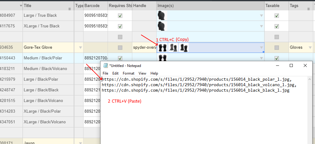 When I copy an ‘Images column’ cell from variant row I will get that single variant image url [NARRATOR picks a variant image cell with image and does CTRL+C. NARRATOR then enters Notepad and does CTRL+V. NARRATOR shows Notepad] .