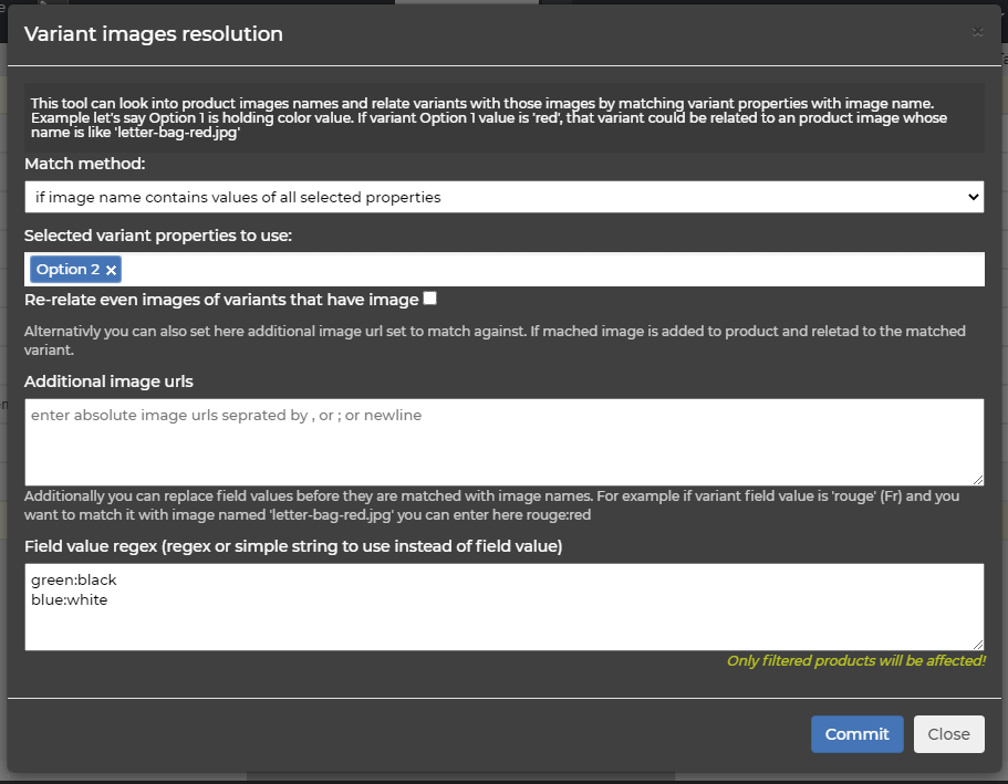 [NARRATOR opens Options->’Images resolve for filtered variants’] We can select a matching method here [NARRATOR shows ‘Match method’ field]. We can choose if we want a broad matching, or exact matching by selecting one of the three offered methods. I will use exact comparison by option 2 in may case. I will not enter anything in ‘Additional image urls’ because in the first go I want to show you that this tool also can distribute images that are already uploaded for a product to its variants.