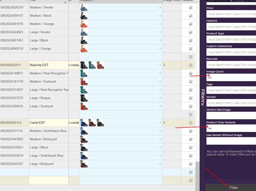 We will set the Image count filter to <4 and Product total variants to >4 . [NARRATOR sets ‘ Image count’ filter to <4 and ‘ Product total variants’ to 4. NARRATOR clicks “Filter” button] .