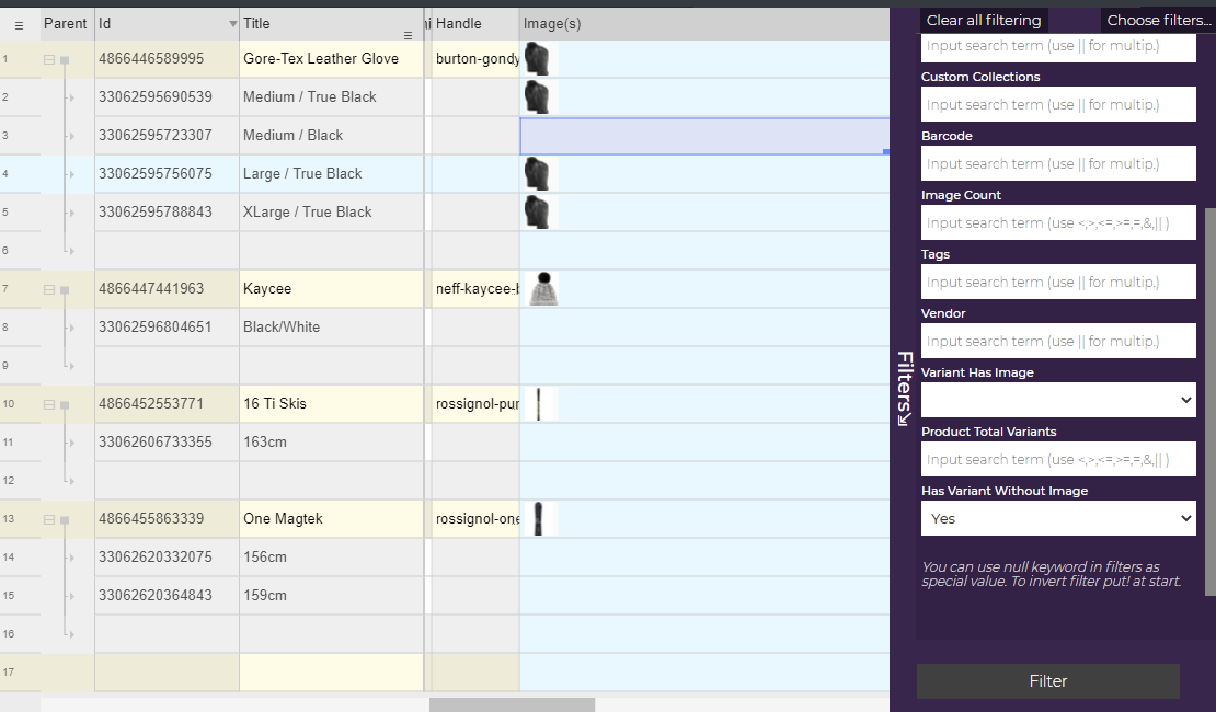 Now we will use the “ Variant has image ” filter [NARRATOR sets ‘ Variant has image’ filter to YES and then clicks ‘Filter’ button ] . We see only variants that have images, and others are filtered out. We have no much use for this, let us try the opposite [NARRATOR sets ‘ Variant has image’ filter to NO and then clicks ‘Filter’ button] .
